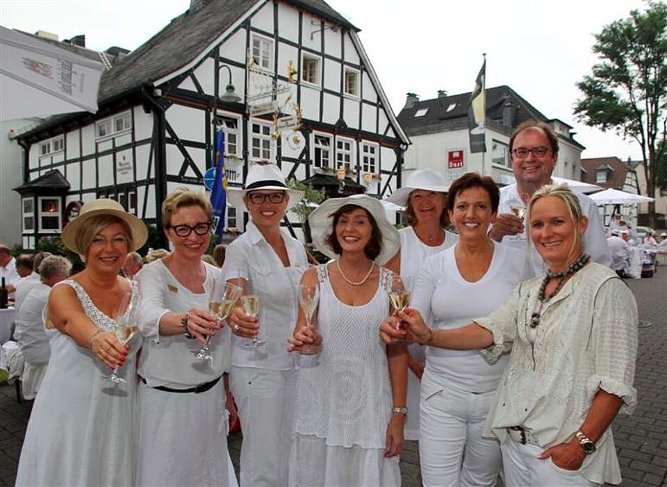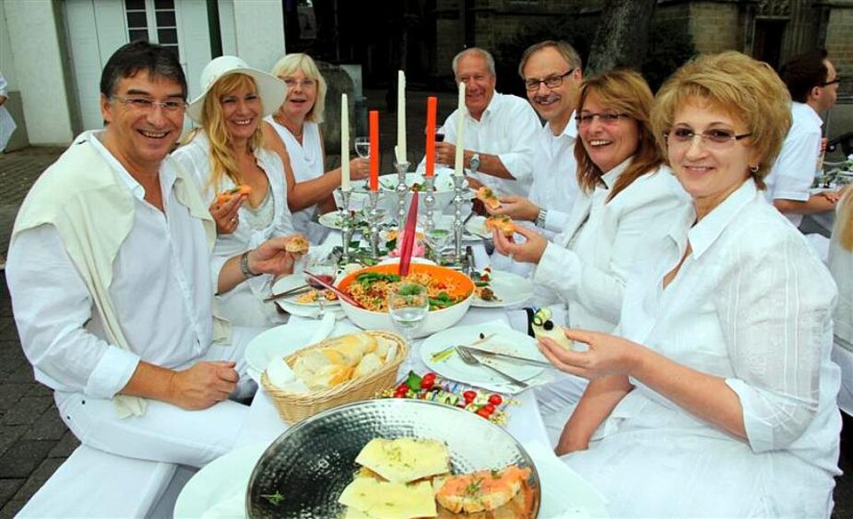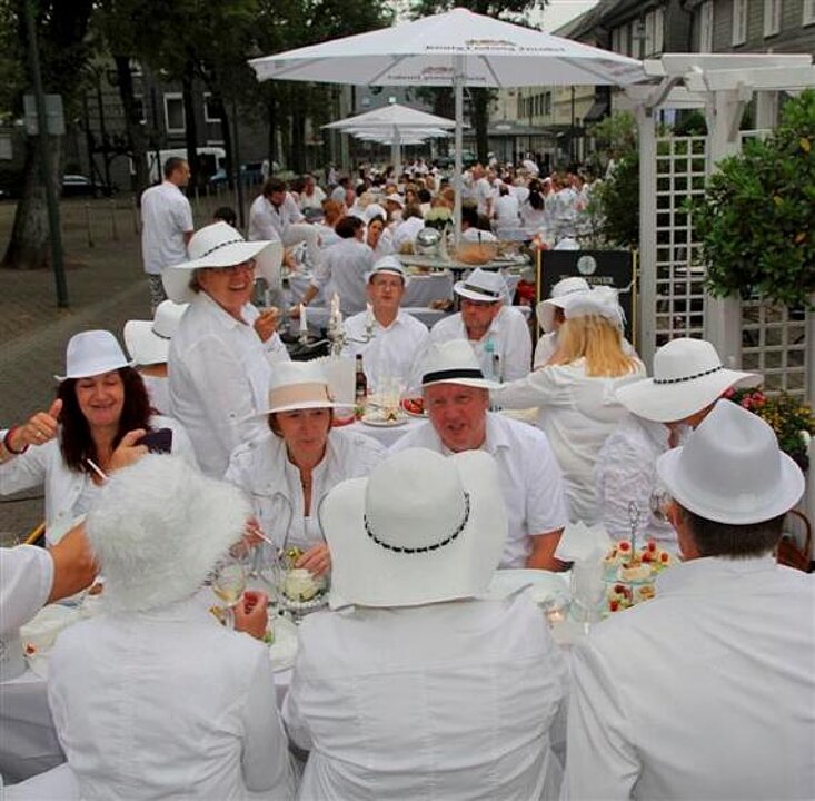 Warstein - Wie ein in Öl gegossenes Gemälde mutete die Szenerie an, die sich dem Spazierenden am Samstagabend bot, als sein Blick beim Verlassen der Gasse unterhalb der Domschänke auf die Dieplohstraße fiel. Über 300 Weißgekleidete hatten an 40 Tafeln Platz genommen – zu Warsteins erstem „Dîner en blanc“.
