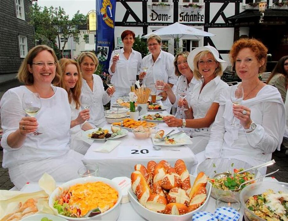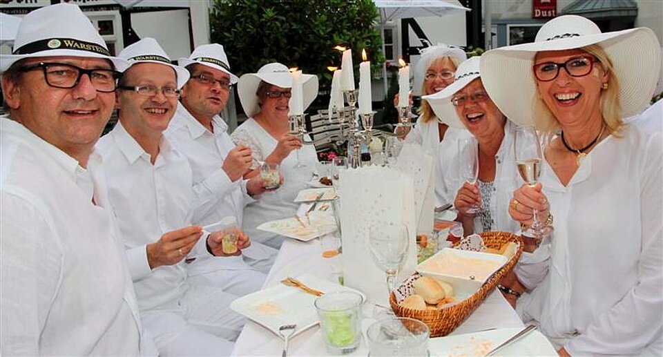 Jedenfalls sorgte der laue und vor allem trockene Abend dafür, dass nicht nur Tischtücher, Hüte, Hemden und Deko in hellem Weiß leuchteten, sondern auch die Gesichter aller rund 300 Beteiligten an den knapp 30 Tischen um die Wette zu strahlen schienen.