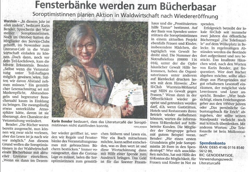 „Der gute Zweck ändert sich Jahr für Jahr, ansonsten bleibt bei uns alles beim Alten.“ Mit dieser Ankündigung zum Auftakt des Literaturcafés am Sonntagnachmittag in der Waldwirtschaft lag Marion Schlaß nicht ganz richtig. Zum einen kommen immer mehr Gäste, wenn Warsteins Soroptimistinnen zum herbstlichen Lesespaß einladen, zum anderen stellte sich mit Ulrike Wiegelmann eine neue, lokale Präsidentin der weltweit agierenden Service-Organisation vor. Darüber hinaus bewährte sich wieder einmal das Charity-Erfolgsrezept aus Büchertrödel, Unterhaltung, Kaffee, Kuchen, spannenden Vorlesegeschichten und einer Spendensammlung für wechselnde Organisationen. Aktuell darf sich die Prostituierten- und Ausstiegsberatung „Tamar“ über Zuwendungen aus Warstein freuen. Wie wichtig die finanzielle Unterstützung ist, erläuterte Katharina Steinbeck. Die Sozialpädagogin arbeitet in der Tamar-Beratungsstelle Soest. Die wird zwar von der Evangelischen Frauenhilfe getragen, doch 20 Prozent der Kosten muss mit Spenden finanziert werden. Als wichtiges Ziel ihrer Arbeit nannte Steinbeck die Beendigung von Diskriminierung und Kriminalisierung der betroffenen Frauen. Wie die „aufsuchende Arbeit“ der vier in Soest tätigen Sozialpädagoginnen aussieht, erfuhren die Anwesenden aus einer kurzen Tätigkeitsbeschreibung: „ Wir gehen dorthin, wo Frauen ihre sexuellen Dienstleistungen anbieten, zum Beispiel in Clubs, Bars, Appartements, Wohnwagen, Wohnungen oder Kneipen.“ Der Kontaktaufnahme folgt eine kurze Beratung, zum Beispiel über Versicherungsfragen oder gesundheitliche Probleme. Oft, aber wenn, dann ausschließlich auf Wunsch der Betroffenen, kommt es zu langzeitlicher Begleitung: „Wir unterstützen beim Ausstieg aus der Prostitution und bei der Entwicklung neuer Lebensperspektiven.“