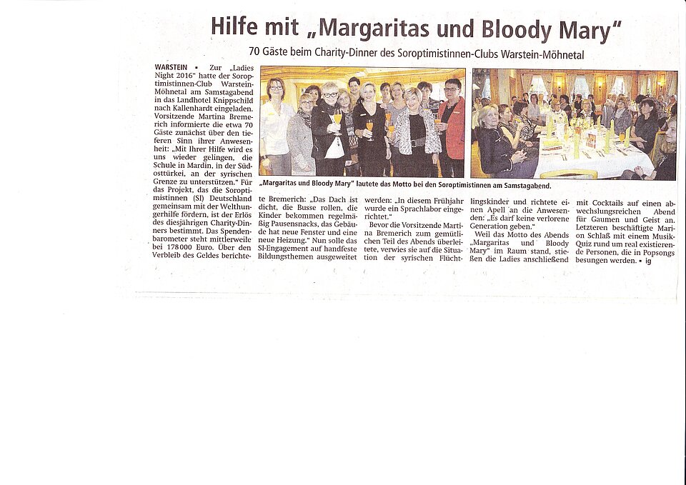 Zu unserer bereits 7. Ladies Night konnten wir in diesem Jahr 70 Gäste im Romantikhotel Knippschild unter dem Motto "Margaritas und Bloody Mary - Ein abwechslungsreicher Abend für Gaumen und Geist" begrüßen. Nach einem leckeren Begrüßungscocktail - eigens von einigen Clubschwestern kreiert - informierte unsere Präsidentin Martina Bremerich über das Projekt "Schule in Mardin". Der Erlös dieses Abends floß in eine von SI Deutschland und der Welthungerhilfe unterstützten Schule in der Südosttürkei für syrische Flüchtlingskinder.