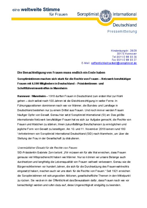 Soroptimist International (SI) ist die weltweit größte Service-Organisation berufstätiger Frauen. SI engagiert sich als Organisation im lokalen, nationalen und internationalen Umfeld für die Menschenrechte, Bildung für Mädchen und Frauen, Frieden, internationale Verständigung und verantwortliches Handeln. SI beteiligt sich aktiv an den Entscheidungsprozessen auf allen Ebenen der Gesellschaft. SI hat weltweit 80.000 Mitglieder in 130 Ländern und aktuell 209 Clubs und 6.300 Mitglieder in Deutschland. Weitere Informationen unter www.soroptimist.de